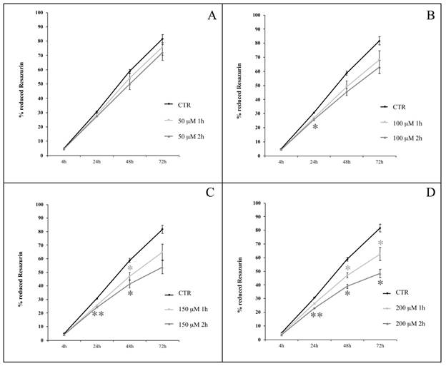 hASC proliferation curves after treatments with H2O2 at concentrations of 50 μM (A), 100 μM (B), 150 μM (C) and 200 μM (D) for 1 or 2 h. Analysis was conducted at 4, 24, 48, 72 h from the end of the treatment; data are expressed as mean of percentage of reduction of Resazurin (n=4, culture passages 6th- 14th) ± SEM, *p<0.05, **p<0.01. CTR is control.