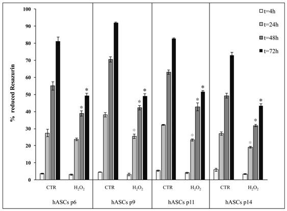 Comparison of cell proliferation between hASCs cultured in the absence (CTR) and presence of H2O2 at four subculture passages (p6, p9, p11 and p14). Treated cells were incubated with 200 μM H2O2 for 2 h. Data were expressed as mean of percentage of reduction of Resazurin (technical triplicate) ± SD; *p<0.05.