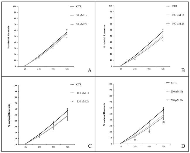 In Figure 6, we show the proliferation curves of hWJ-MSCs treated for 1 and 2 h with H2O2 at concentrations ranging from 50 to 200 μM. Cells were obtained from four healthy subjects (passages of subculture spanning from 6th to 16th). H2O2 at 50, 100 and 150 μM had a weak effect on hWJ-MSCs (Figure 6A, 6B and 6C), while a 2-h exposure to the higher concentration of H2O2 (200 μM) resulted in a significant decrease in the percentage of Resazurin reduction, as compared with control cells. This was evident at 24, 48 and 72 h following termination of the H2O2 treatment (p<0.05) (Figure 6D).