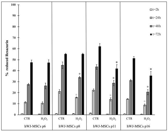 Comparison of cell proliferation between hWJ-MSCs cultured in the absence (CTR) and presence of H2O2 at four subculture passages (p6, p8, p11 and p16). Treated cells were incubated with 200 μM H2O2 for 2 h. Data were expressed as mean of percentage of reduction of Resazurin (technical triplicate) ± SD; *p<0.05.