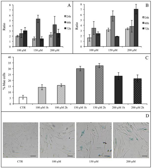 hWJ-MSC SA β-Gal activity after H2O2 treatment. Effect of H2O2 treatment expressed in term of ratio between the percentage of blue cells in treated sample and the relative percentage of blue cells in untreated sample after 1 h (Panel A) and 2 h (Panel B) of treatment. In each panel the effect of every H2O2 concentration was presented after 24, 48 and 72 h from the end of the stimulus. Data were obtained in triplicate from one subject and expressed as ratio (n=3) ± SD. Control value is 1 (not shown) and treatment was arbitrarily considered effective when ratio was >3. In Panels (C) and (D) the effects of different H2O2 concentrations on hWJ-MSC SA β-Gal activity tested at 48 h from the end of the treatment are shown. In Panel (C), a graph representative of three (obtained from three different subjects) showing the percentage of blue cells in untreated (CTR) and treated cells after 1 and 2 h of H2O2 treatment. Data were expressed as percentage of blue cells ± SD. Panel (D): representative SA β-Gal staining images of hWJ-MSCs untreated (CTR) and treated with H2O2 at final concentrations of 100 μM, 150 μM and 200 μM after 2-h treatment. Cells were analyzed under a light microscope (at 200× magnification) and cell images were detected under bright field illumination with the Leica MC170 HD Imaging System. Blue staining indicates senescent cells and scale bars correspond to 100 μm.