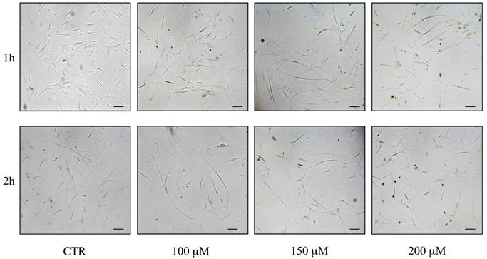 Morphological changes of hASCs after reseeding post H2O2 treatments: control (CTR) cells and cells treated with H2O2 100, 150 and 200 μM. Cells were analyzed under a light microscope (at 200× magnification) and cell images were detected under bright field illumination with the Leica MC170 HD Imaging System. Scale bars: 100 μm.