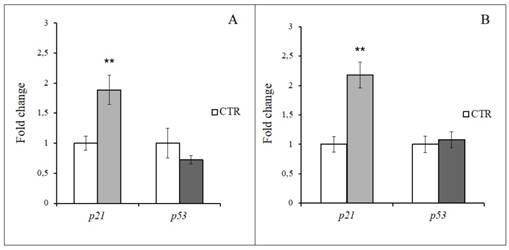 Gene expression analysis in hASCs and hWJ-MSCs after 48 h from 2h-H2O2 treatment. A: p21 and p53 relative expression in hASCs treated with 150 μM H2O2. B: p21 and p53 relative expression in hWJ-MSCs treated with 200 μM H2O2. Data were expressed as mean fold change (n=3) ± SD, **p<0.01.