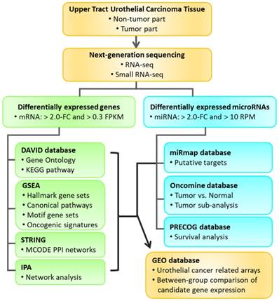 Flowchart of study design. Clinical specimens were obtained from two patients of upper urinary tract urothelial carcinoma (UTUC) for RNA and small RNA deep sequencing. The differentially expressed genes between tumor and non-tumor tissues were selected for enrichment analyses using various bioinforatmics databases. Furthermore, putative targets of selected differentially expressed microRNAs were predicted by miRmap database. The expression pattern and outcome prediction of candidate genes were analyzed using Oncomine database and Prediction of Clinical Outcomes from Genomic Profiles (PRECOG) database. Candidate genes with significant prognostic prediction were then validated in related urothelial carcinoma arrays in the Gene Expression Omnibus (GEO) database.
