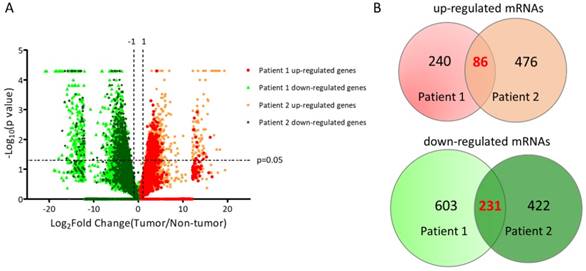 Plotting of differential expression patterns between UTUC tumor and non-tumor tissues from deep sequencing. (A) The differential gene expression between UTUC tumor and non-tumor tissues from two UTUC patients were plotted by volcano plot. The x-axis represented the expression fold-change (tumor/non-tumor) in log2 transformation and the y-axis represented the p-value in negative log10 transformation. Markers in green indicated down-regulated genes, whereas markers in red and orange indicated up-regulated genes in UTUC tumor tissues. (B) The Venn diagram analysis of dysregulated genes from two pairs of UTUC tissues identified 86 up-regulated genes and 231 down-regulated genes in UTUC tumor tissues.