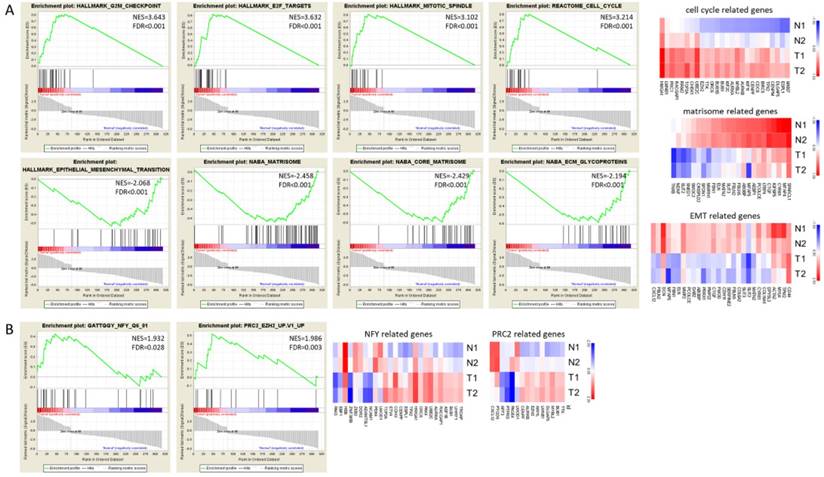 The GSEA enrichment analysis was also performed for gene sets of hallmarks, canonical pathways, motif and oncogenic signatures. The gene sets enriched in UTUC tumor tissues included G2M checkpoint, E2F targets, mitotic spindle and cell cycle canonical pathway (Figure 4A upper panel), whereas matrisome and ECM glycoprotein related canonical pathways and epithelial mesenchymal transition gene sets were enriched in UTUC non-tumor tissues (Figure 4A lower panel). The expressions of genes in related gene sets were displayed as heat maps in Figure 4A. Additionally, the motif gene set analysis indicated nuclear factor Y (NFY) as transcriptional factor targeting the dysregulated genes in UTUC tumor tissues, and the oncogenic signature gene set analysis indicated the representative gene signatures in polycomb repressive complex 2 (PRC2)/enhancer of zeste homolog 2 (EZH2) (Figure 4B).