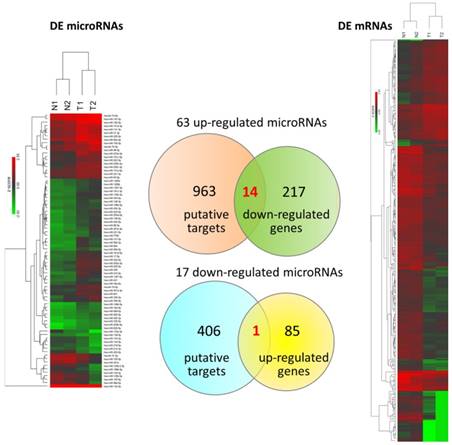 Differentially expressed microRNAs and mRNAs with potential microRNA-mRNA interactions identified in UTUC. The heat maps with hierarchical clustering of differentially expressed microRNAs and mRNAs in UTUC are shown on the left and right panels, respectively. Putative targets of differentially expressed microRNAs were predicted using miRmap database, setting the repression score at ≥ 99.0. The candidate genes were those overlapping with differentially expressed mRNAs in UTUC, as shown in Venn diagram on the middle panel.