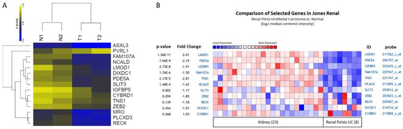 Expression patterns of candidate genes with potential microRNA-mRNA interactions in UTUC datasets. (A) The heatmap with log2 transformed z-score and hierarchical clustering of 15 candidate genes in two pairs of UTUC tissues. Yellow color indicated increased expression, and blue color indicated decreased expression. (B) The expression patterns of candidate genes were assessed in renal pelvis urothelial carcinoma dataset. The result of heatmap analysis was extracted from Oncomine database, with relative color scale indicating log2 median-centered relative expression intensity. Red color represented high expression, and blue color represented low expression. The gene symbols with corresponding probes were indicated on the right side of each row. The p-values and fold-changes of each gene were indicated on the left side of each row.