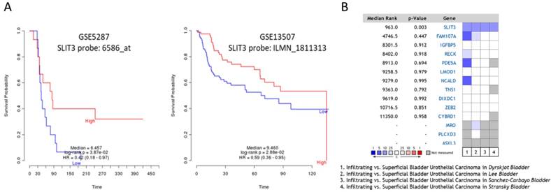 To predict the prognostic value of these candidate genes, the PRECOG database was used to determine the meta-Z score of each of the following genes: LMOD1, PDE5A, IGFBP5, FAM107A, TNS1, NCALD, and SLIT3. The higher meta-Z scores were observed in SLIT3 (meta-Z score = -2.47) and FAM107A (meta-Z score = -1.24) for bladder cancer, and no data available for UTUC in the database. The Kaplan-Meier plots for SLIT3 expression in two datasets (GSE5287 and GSE13507) were extracted from the PRECOG database, as displayed in Figure 8A, indicating lower survival probability in bladder UC patients with low SLIT3 expression. The expression pattern of SLIT3 between superficial and infiltrating bladder UC in Oncomine database was further investigated. There were four datasets comparing the expression pattern of SLIT3 between superficial and infiltrating bladder UC available, including Lee, Dyrskjøt, Sanchez-Carbayo, and Stransky (superficial bladder UC=25, infiltrating bladder UC=32). The results indicated higher ranking of SLIT3 under-expression in infiltrating bladder UC across each dataset (Figure 8B).
