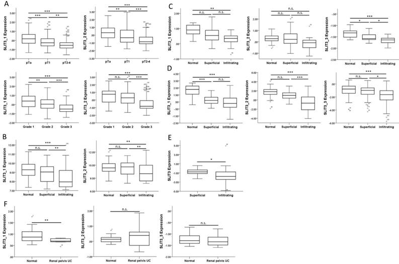 Expression pattern of SLIT3 among different stages of urothelial carcinoma. (A) The expression value of SLIT3 among different tumor stage and tumor grading in a bladder cancer dataset (GSE32894) was lower in advanced stage and grade. Similar expression pattern of SLIT3 was observed in (B) Lee, (C) Dyrskjot, (D) Sanchez-Carbayo, and (E) Stransky (SLIT3 probe: 35324_at) bladder cancer datasets, and (F) Jones renal pelvis urothelial carcinoma dataset. (probe information: SLIT3_1: ILMN_1864685; SLIT3_2: ILMN_1811313 for (A), (B); SLIT3_1: 203812_at; SLIT3_2: 203813_s_at; SLIT3_3: 216216_at for (C), (D), (F)).