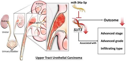 The current study identified the differentially expressed genes in UTUC tissues were associated with aberration in cell cycle and ECM-related genes, analyzed by systematic bioinformatics approach. In addition, low tissue expression of SLIT3 in invasive UC was potentially a prognostic predictor of poor survival rate. Among the 15 candidate genes with potential miRNA-mRNA interactions, novel miR-34a-5p was a potential regulator of SLIT3, which may infer the potential role of miR-34a-5p-SLIT3 regulation in the altered TME in UC. A schematic figure summarizing the proposed molecular signatures of UTUC is displayed in Figure 11.