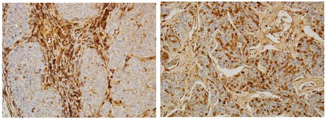 Immunohistochemical staining for VEGF shows the cytoplasm of tumor cells stained brown (dark) on 10th day (×400)(A), and 44th day (× 400)(B).