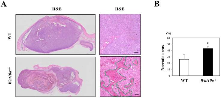 Wnt10a-/- mice showed increased necrosis in the murine melanoma B16-F10 cell transplantation model. (A) Representative photomicrographs of H&E-stained sections in the murine melanoma B16-F10 cell transplantation model, bar=100 µm. (B) The transplanted melanomas in Wnt10a-/- mice contain significantly larger necrotic areas (green line in HE) than those in WT mice.