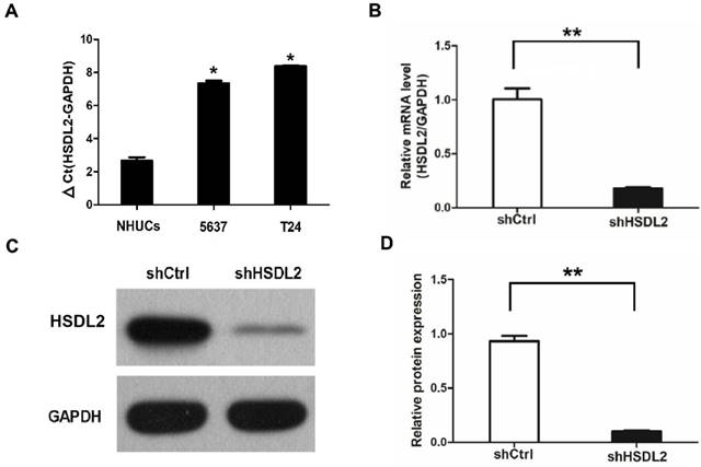 HSDL2 knockdown in BCa cells. A. HSDL2 expression at mRNA level in two human BCa cell lines 5637 and T24, and normal human urothelial cells (NHUCs). *P< 0.05 vs. NHUCs. B. HSDL2 expression at mRNA level in T24 cells after infection with shRNA lentivirus. **P< 0.01. C. Western blot analysis of HSDL2 protein level in T24 cells after infection with shRNA lentivirus. D. Densitometry analysis of HSDL2 protein level in T24 cells after infection with shRNA lentivirus. **P< 0.01.
