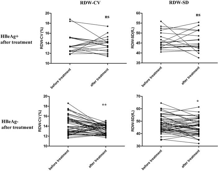 Comparison of RDW levels of HBeAg+ CHB patients before and after antiviral therapy. 65 HBeAg+ CHB patients who were treated with entecavir for more than half a year were enrolled and RDW levels before and after treatment were analyzed. Among the 65 patients, 47 were diagnosed to become HBeAg- after the treatment and 18 were still HBeAg+. We separately compared RDW levels before and after treatment for these two groups for both RDW-CV and RDW-SD, by paired student's t test. ***p<0.001; *p<0.05; ns, not significant.