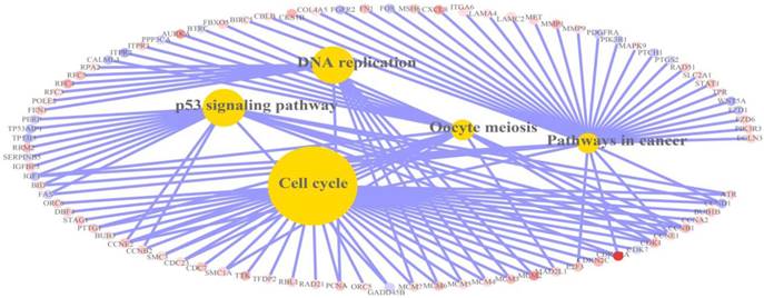 KEGG pathway enrichment analysis. KEGG pathway analysis found that DEGs were significantly enriched in 5 pathways as shown in Figures 4-5. To be specific, 33 up-regulated DEGs and 3 down-regulated DEGs were significantly enriched in cell cycle-associated pathways. Thirteen up-regulated DEGs were significantly enriched in DNA replication-associated pathways. Ten up-regulated DEGs and eight down-regulated DEGs were significantly enriched in p53 signalling pathways. Eleven down-regulated DEGs and 26 up-regulated DEGs were significantly enriched in pathways in cancer. Thirteen up-regulated DEGs and five down-regulated DEGs were significantly enriched in oocyte meiosis. The detailed analysis results of the top 5 pathways with high enrichment significance levels are displayed in Table 2; these results indicated that cell cycle-associated pathways had the highest fold over-expression.
