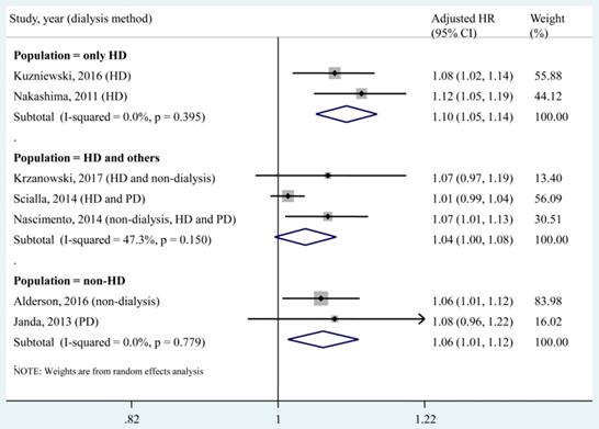 A subgroup analysis was conducted according to different dialysis methods (Fig. 5). We found that each 1 pmol/L increase in the circulating OPG level was significantly associated with increased risk of all-cause mortality in the population that underwent only HD (2 studies, adjusted HR, 1.10; 95% CI, 1.05-1.14). In addition, the pooled estimate of the subgroup including the HD population and others (adjusted HR, 1.04; 95% CI, 1.00-1.08) was obviously lower than that of the HD only subgroup.