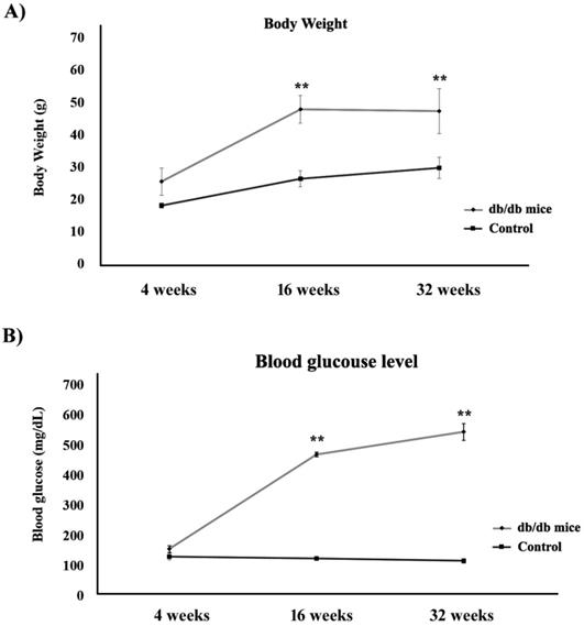 Estimation of (A) body weight and (B) blood glucose levels in control (■) and T2DM (●) mouse models (**, P < 0.05).