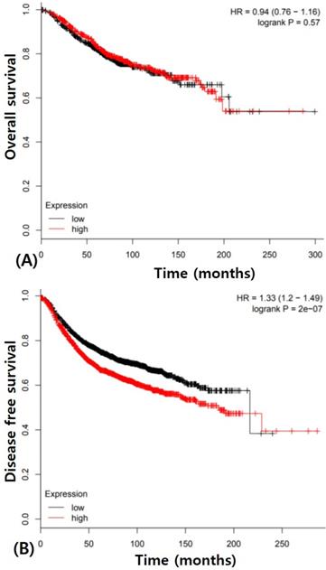 Survival analysis in breast cancers according to PIK3CA expression using The Cancer Genome Atlas (TCGA) data (A) Overall survival (B) Disease free survival.