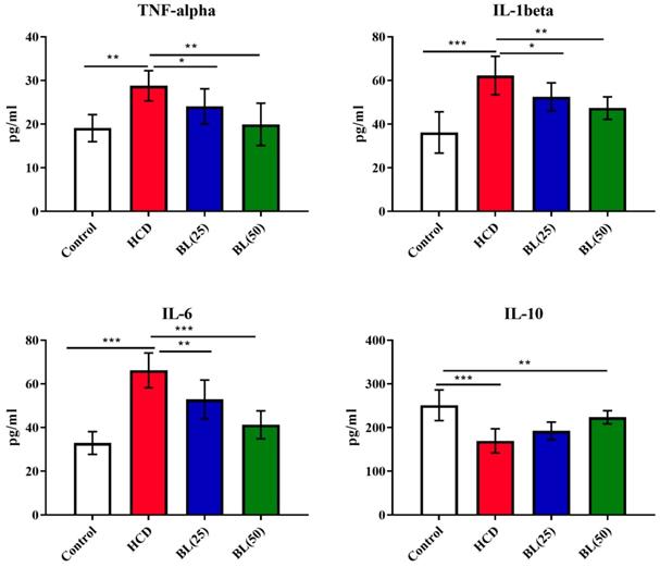 Effect of BL on hypercholesterolemia-induced changes in serum inflammatory biomarkers including tumor necrosis factor-alpha (TNF-α), interleukin-6 (IL-6), interleukin-1beta (IL-1β) and interleukin-10 (IL-10). Data are expressed as the mean ± SEM (n= 6 per group). Statistically significant difference was considered at *p < 0.05, **p < 0.01and ***p < 0.001.