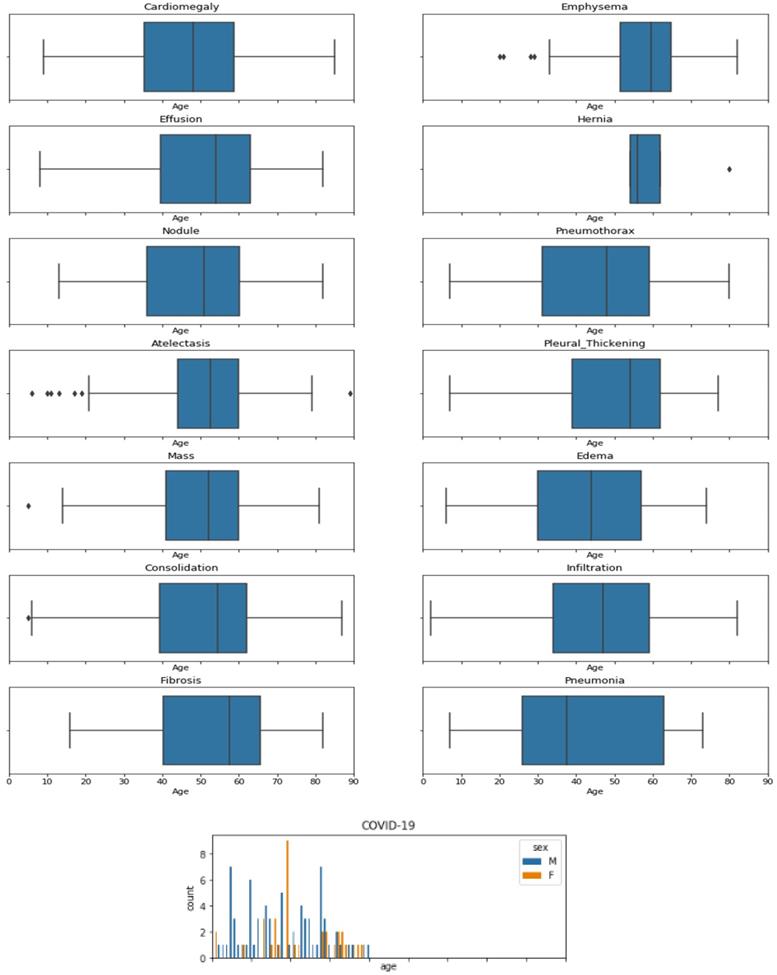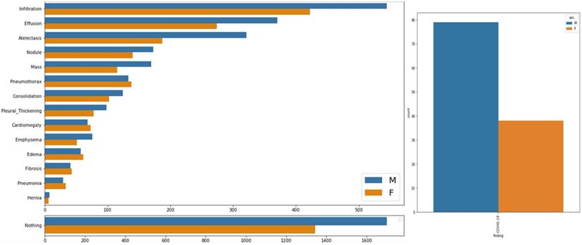 In order to analyze the data, the author plotted it statistically using matplotlib from python. Here Figure 1 shows gender distribution for all the diseases other than COVID-19 which is shown in right side of Figure 1. It can be seen clearly that which gender is affected more by which disease i.e. Infiltration, Atelectasis, Consolidation, Emphysema, Hernia, Effusion, Nodule, Pleural Thickening and COVID-19 affect male more, than female. On the other hand, Pneumothorax, Edema and Emphysema affect more females than male.