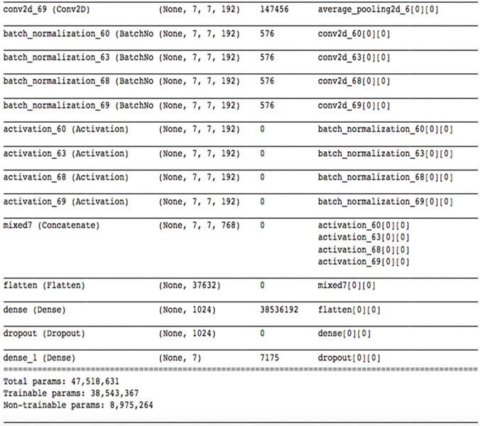 A state-of-the-art pretrained model named inceptionV3 [9] is used for transfer learning. Motivation behind using inceptionV3 as transfer learning as it gives lower error rate and was runner up in “ImageNet Large Scale Visual Recognition Competition 2015”. It contains 1024 fully connected layers with ReLU as activation function, except for the output layer where Softmax is used. Due to the dropout of 0.2, it prevents overfitting. InceptionV1 previously named GoogleNet was introduced by Szegedy et al. [10]. After that many variants of this model came along with Inception V2 [11] with an addition of batch normalization. After that idea of factorization was added by the same author and Inception-v3 was introduced. This is a powerful model which can solve heavy computations without introducing much complexity. Input and output for this model is same as described in Model 1. Figure 4 shows details of Model 2. Augmentation was done in same manner described in Model 1.