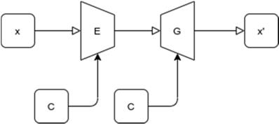 GAN model used for image generating purposes was proposed by Jianmin Bao et al. [7]. Proposed GAN model is a combination of variational auto-encoder and GAN which generate fine grained images. The details of the network can be found in [7]. Figure 6 shows a generic structure of proposed GAN model. In the figure x and x' are input and generated image. E and G are encoder and generator network, respectively. z is the latent vector. c is the condition, such as attribute or class label.
