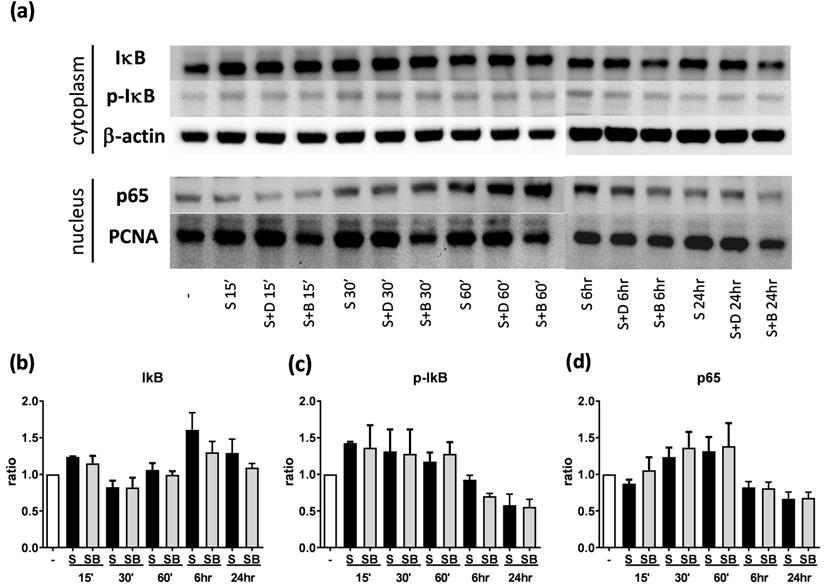 Western blot analysis of IκB, p-IκB, and p65 in pro-inflammatory cytokine stimulated BEAS-2B cells with berberine pre-treatment. Total cell proteins were collected at 15 min, 30 min, 60 min, 6 hours, and 24 hours of IL-4 plus TNF-α stimulation in BEAS-2B cells with berberine (1 μM) pre-treatment. (A) Expression levels of IκB, p-IκB, and p65 proteins were analyzed using western blotting (20 μg per sample). The relative quantity of (B) IκB (n=6), (C) p- IκB (n=3) and (D) nucleus p65 (n=6) was normalized to β-actin and PCNA, respectively. β-actin and PCNA expression was used as an internal control. Results are presented as mean ± SEM. -, cell only; S, pro-inflammation cytokine stimulation; D, DMSO, B, berberine.