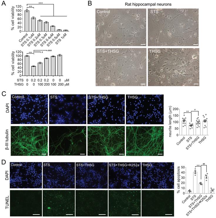 THSG attenuates STS-induced cytotoxicity in rat hippocampal neurons. THSG rescued the cell viability of neurons (A) and eliminated their morphological collapse from STS-induced cytotoxicity (B). (C) Immunofluorescent staining of β-III tubulin (a marker protein of neurons) and DAPI (nuclei) suggested the maintenance of neuronal morphology mediated by THSG from STS-induced toxicity. Neurite length was measured by Image J. **, p<0.01; #, p<0.05. (D) TUNEL experiments reported the THSG mediated inhibition of STS-induced apoptosis. However, TrkB inhibitor K252a antagonized the activity of THSG. ***, p<0.001. ##, p<0.01. (B-D) One-way ANOVA was performed to compare the statistical significance among groups and Bonferroni's multi-comparisons test was used to correct the p value. STS, 0.2 µΜ; THSG, 200 µM. Scale bar, 25 µm.