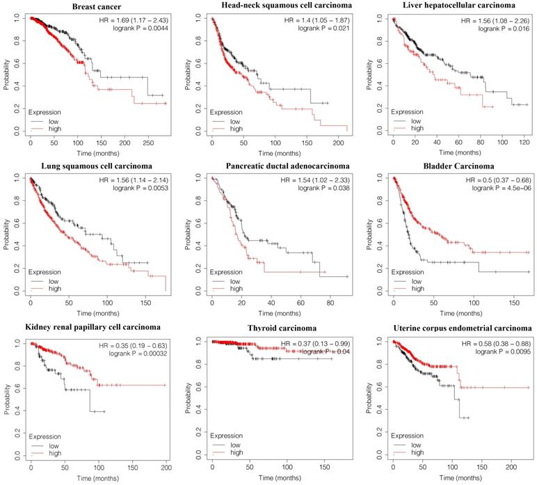 Correlation between HNF1B expression and the overall survival of cancer patients (Kaplan-Meier analysis).