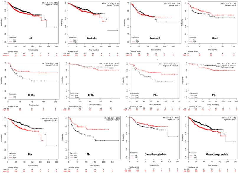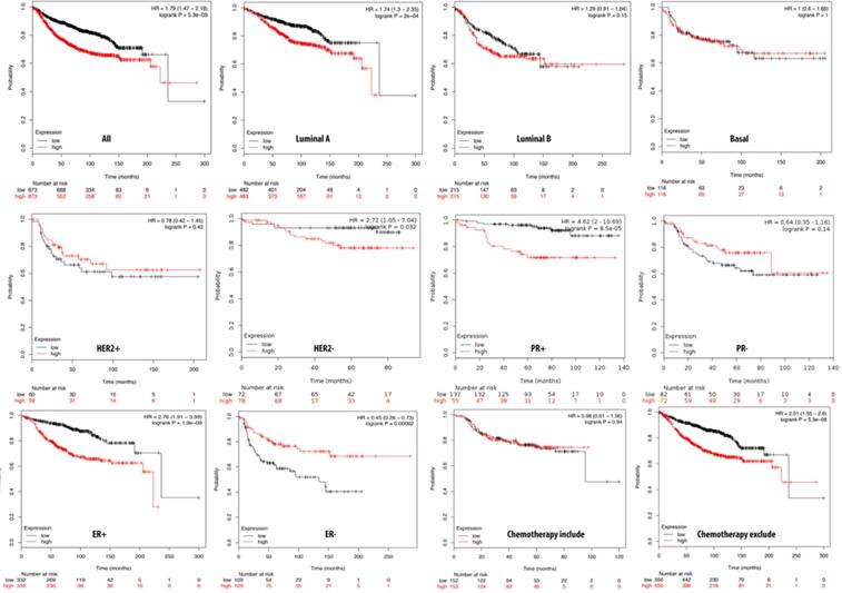Relationship of pituitary tumor-transforming gene 3 (PTTG3) expression and distant metastasis-free survival (DMFS) of clinical breast cancer patients (n=2898). Kaplan-Meier graphs show the DMFS prognosis of breast cancer patients, based on high or low PTTG3 mRNA expression. We used the median of expression as the cutoff; therefore, patients were divided into two groups based on the overexpression and under-expression of PTTG3 mRNA. Patients with expression higher and lower than the median are shown in red and black, respectively. High PTTG3 expression was associated with poor survival in progesterone receptor (PR)- and estrogen receptor (ER)+ subtypes and patients excluded from chemotherapy, whereas high PTTG3 expression was associated with a better survival rate (total patient number=2898, p<0.05 considered significant).
