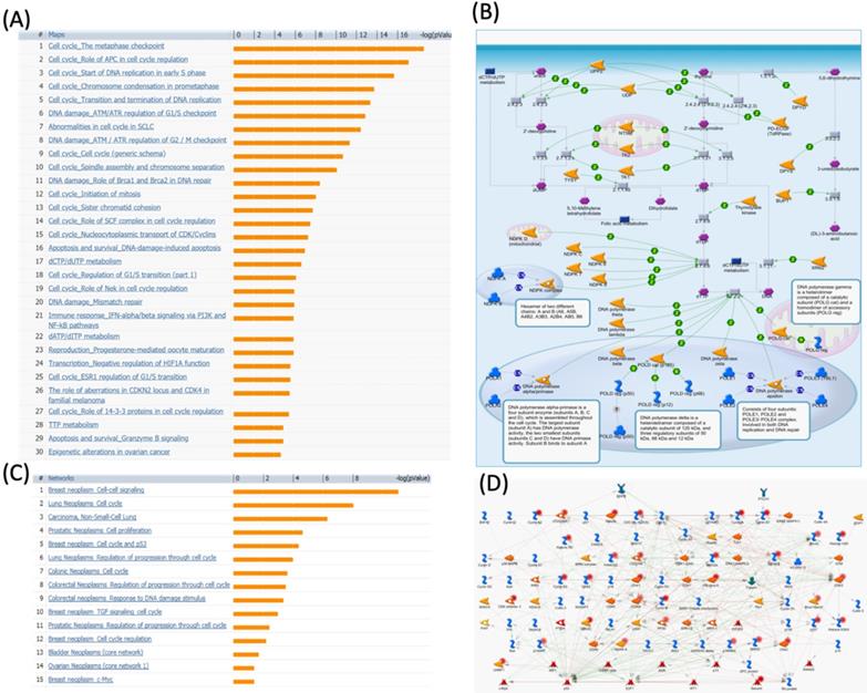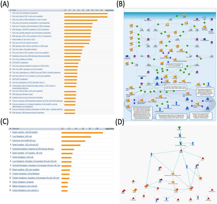 MetaCore pathway analysis of pituitary tumor-transforming gene 1 (PTTG1) coexpressed genes in a breast cancer database. Genes coexpressed with PTTG1 from METABRIC breast cancer patients were exported to the MetaCore pathway analysis tool to explore potential gene networks and signaling pathways impacted by the selected genes. (A) The MetaCore pathway analysis of "biology process" indicated that the cell cycle-related pathway and (B) The thiamine triphosphate (TTP) metabolic pathway were significantly associated with breast cancer development. (C) The MetaCore pathway analysis of "disease biomarker networks" indicated that the cancer-related pathway and (D) the "breast neoplasm cell-cell signaling" pathway were significantly associated with breast cancer development.