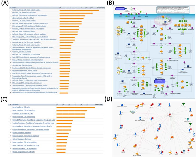 MetaCore pathway analysis of the pituitary tumor-transforming gene 2 (PTTG2) coexpressed genes in a breast cancer database. Genes coexpressed with PTTG2 from METABRIC breast cancer patients were exported to the MetaCore pathway analysis tool to explore potential gene networks and signaling pathways impacted by the selected genes. (A) The MetaCore pathway analysis of "biology process" indicated that the apoptosis-related pathway and (B) the "glycolysis and gluconeogenesis" pathway were significantly associated with breast cancer development. (C) The MetaCore pathway analysis of "disease biomarker networks" indicated that the cancer-related pathway and (D) the "breast neoplasm cell-cell signaling" pathway were significantly associated with breast cancer development.