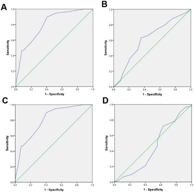 Receiver Operating Characteristic (ROC) was used to select the optimal cut-off score for positive expression of TPM4: A. pT stage. B. Histological grade. C. Clinical stage. D. Sex. The cut-off score is 67.5%.