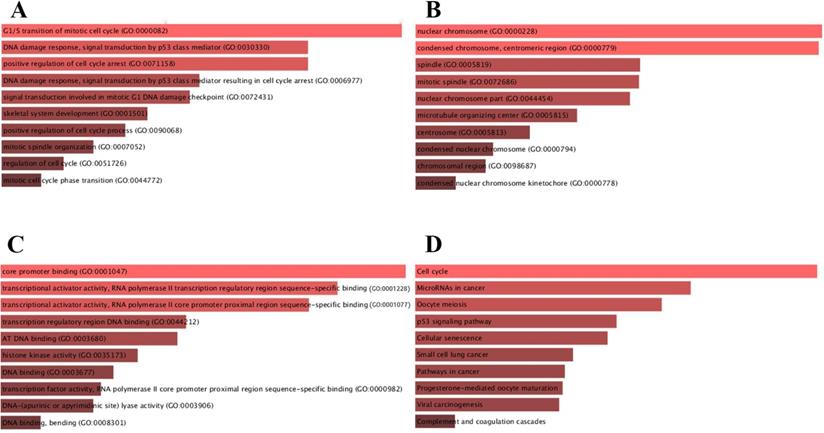For deeper insights in biological functions, candidate target genes were subjected to the Enrichr database. BP, CC and MF were analyzed in GO annotation (Fig. 4). BP analysis suggested that candidate target genes were mainly enriched in G1/S transition of mitotic cell cycle, DNA damage response and signal transduction by p53 class mediator (Fig. 4A). CC analysis showed that mRNAs were significantly enriched in nuclear chromosome, condensed chromosome and centromeric region (Fig. 4B). MF results indicated that candidate target genes were mainly enriched in core promoter binding and transcriptional activator activity and RNA polymerase II transcription regulatory region sequence-specific binding (Fig. 4C). We further identified the KEGG pathway and found that enriched pathways for most of the genes were cell cycle and microRNAs in cancers as shown in Fig. 4D.