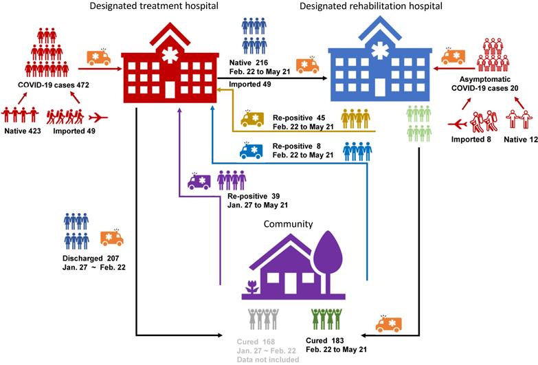 Cohort information. There were 472 confirmed CoVID-19 patients (423 native and 49 imported) and 20 asymptomatic carriers (12 native and 8 imported) in total. 207 of the 472 were discharged before February 21st (line black), 168 of the 207 were non-re-positives and were not involved in the study (line Grey).There were 92 re-positives in total, 45 of them turned re-positive during medical observation (line yellow), 8 of them turned re-positive at community test after medical isolation observation (line blue), and 39 cases discharged before February 21st and found re-positive in community test (line violet).
