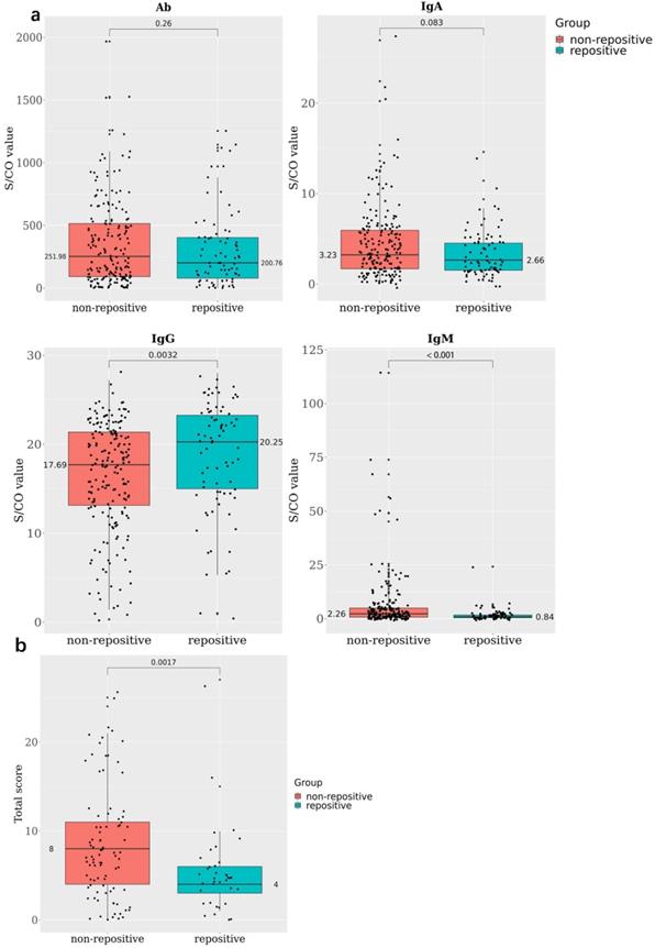 In all, 78 RP and 190 NRP patients conducted antibody detection tests; 46.15% of the RP and 66.32% of the NRP patients were positive for IgM, 98.72% of the RP and 99.47% of the NRP patients were positive for IgG, and all patients in both RP and NRP groups were positive for total antibody (Ab). The S/COI of IgG was remarkably higher in the RP group than in the NRP group (20.25 and 17.69, respectively, P < 0.005) (Figure 2A).