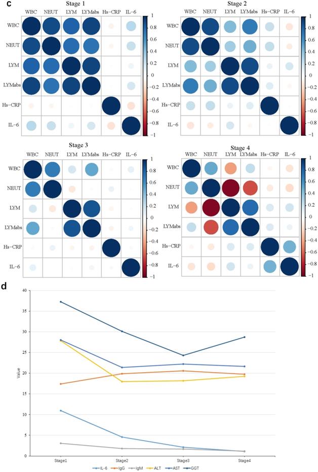 Forty-one patients stayed in medical isolation observation for more than 2 months owing to repeated positive nucleic acid findings; they went through four stages of antibody and blood biochemistry tests (Figure S3). All IgG tests showed positive results, and IgM-positive rates decreased from 57.9% in the first stage to 23.7% in the fourth stage (Table S3). Meanwhile, the WBC, neut, lym%, and lym abs were positively correlated at stage 1, and the positive correlations among them decreased in stages 2 and 3 and turned to negative in stage 4 (Figure 2C). At the same time, the IL-6 value decreased gradually at each stage; this means the inflammatory response of RP patients were falling to normal levels. Indicators related to liver functions such as ALT, AST, and γ-glutamyl transpeptidase (GGT) rapidly levelled out (stage 1 and 2) and stabilized (stage 3 and 4); this showed that the damaged liver functions were recovering (Figure 2D).