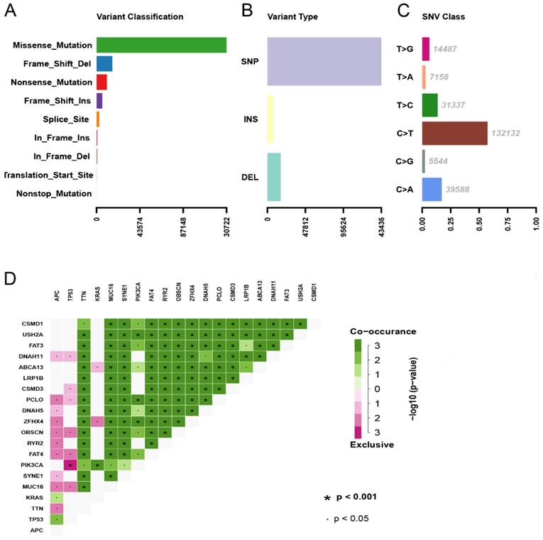 Summary of the mutation information with statistical calculations. (A, B) Variant classification and type of genetic alterations in COAD. (C) The SNV class of COAD; (D) The coincident and exclusive associations across mutated genes. SNP, single nucleotide polymorphism; SNV, single nucleotide variants.