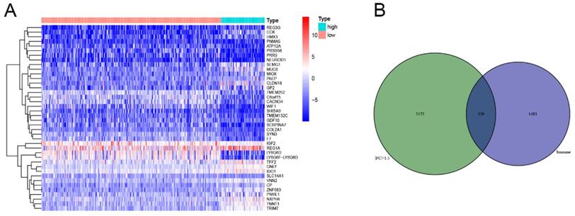 Comparisons of gene expression profiles in low- and high-TMB samples. (A) Top 30 DEGs were shown in heatmap plot; (B) Identification of TMB-related immune genes.