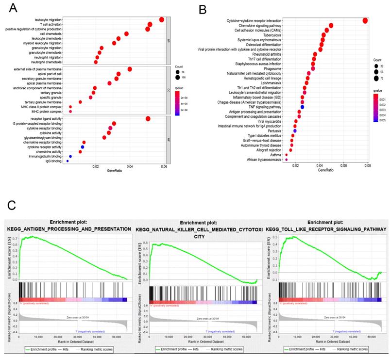 The division of the COAD samples into two groups, according to the TMB level, resulted in 323 samples classified as low-TMB level cases and 76 as high-TMB level cases. A total of 2504 DEGs were identified between the low- and high-TMB level groups based on the screening criteria (FDR <0.05 and FC >1.5). The top 30 significant DEGs were visualized on a heatmap (Figure 3A). Then, GO and KEGG enrichment analyzes were conducted to explore the biological roles of the identified DEGs. GO enrichment analysis showed that the DEGs were mainly enriched in the biological process (BP) terms associated with T cell activation, positive regulation of cytokine production, migration and chemotaxis of inflammatory cells including leukocytes, granulocytes and neutrophils (Figure 4). KEGG enrichment pathway analysis revealed that DEGs mainly participated in following pathways: cytokine-cytokine receptor interaction, chemokine signaling, cell adhesion molecules (CAMs), Th17, T1 and T2 cell differentiation, natural killer cell-mediated cytotoxiccity and immune-related diseases (Figures 4A and,B). GSEA analysis in the high-TMB level group showed that genes were enriched in several pathways, including immune-related pathways, such as antigen processing and presentation, Toll-like receptor signaling and natural killer cell-mediated cytotoxicity (Figure 4C). All significantly enriched pathways (P<0.05) are listed in Supplementary Table 1.