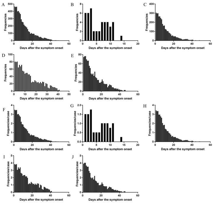 All symptoms over the whole course in the cohort were collected and the occurrence of a certain symptom was counted as one regardless of its frequency and intensity in that day while no symptom occurrence was counted as zero in that day, and the counted result was designated as the symptom frequency of that day for quantitative analysis in the further study. Every five-day from the onset day were designated as T1, T2, …, Tn, successively, where T1 was the first five-day period. In this cohort, the duration from disease onset to the day when 95% frequencies of all symptoms in the cohort disappeared was designated as the course and the duration from symptom onset to the day when all patients discharged or died was designated as the whole course.