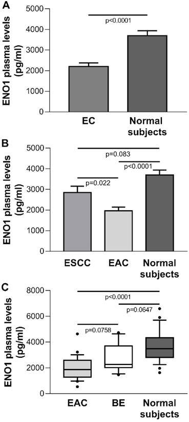 (A) Plasma ENO1 concentration by ELISA in EC patients and normal subjects. P-values obtained by Student's t test. (B) Plasma ENO1 concentration by ELISA in EC patients categorized by histological type of tumor (ESCC and EAC) and normal subjects. Results are expressed as mean±SE. ENO1 concentration (pg/ml). P-values obtained by Unpaired Studentì's t-test. (C) Plasma ENO1 concentration by ELISA in normal subjects, BE and EAC patients. Median, 10th, 25th, 75th, and 90th percentiles are presented as vertical boxes with error bars. Dots indicate outliers. P-values obtained by Kruskal-Wallis One Way Analysis of Variance on Ranks followed by All Pairwise Multiple Comparison Procedures (Dunn's Method).