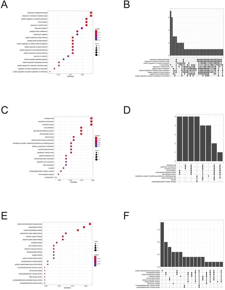 To further clarify the functions of these 88 target genes, the results of GO and KEGG enrichment analysis were performed and presented by the R package “clusterProfiler”. The top 3 most enriched GO of differential genes were response to lipopolysaccharide, response to molecule of bacterial origin and positive regulation of cytokine production; membrane raft, membrane microdomain and membrane region; protein serine/threonine kinase activity, phosphatase binding and protein phosphatase binding by GO-BP, GO-CC and GO-MF, respectively (Fig. 3 and 4). Meanwhile, as shown in Figure 5, differential genes were most enriched in Kaposi sarcoma-associated herpes virus infection, human cytomegalovirus infection and apoptosis by KEGG pathway analysis. Each kind of the graphs represent different emphasis of the GO enrichment and KEGG pathway analysis. The bubble graphs (Fig. 3A, C and E; Fig. 5A) show the most significant GO terms/KEGG pathways, and also show the size of gene sets; the map graphs (Fig. 4B, D and F; Fig. 5D) integrate the GO terms/KEGG pathways and overlapped genes as a net, and the overlapped gene sets tend to occur in clusters; the gene concept network graphs are the network graphs that show the relationships and complicated associations between genes and the GO terms/KEGG pathways. These graphs (Fig. 4A, C and E; Fig. 5C) place emphasis on the details of the genes and GO terms/KEGG pathways, while the others place emphasis on the overlapping condition between genes of different gene sets involved (Fig. 3B, D and F; Fig. 5B).