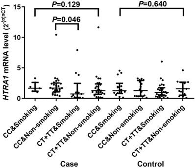 A significant difference of the mRNA expression levels (2-∆∆CT) was found between CC [1.590 (0.945, 2.481)] and CT/TT [0.997 (0.375, 1.982)] genotypes of rs2268350 in IS cases with P value of 0.044 but not in controls (P>0.05). In addition, the mRNA level (2-∆∆CT) of HTRA1 in non-smokers with rs2268350 CC [1.647 (1.137, 2.493)] was significantly higher than smokers with rs2268350 CT/TT [0.686 (0.160, 1.676)] (P=0.046) in IS cases (Figure 1). All the mRNA levels (2-∆∆CT) of different genotypes for each tagSNPs were listed in Supplementary Table S6.