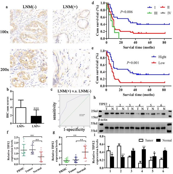 Expression and significance of TIPE2 in tumor tissues with and without lymph node metastasis (LNM). Kaplan‑Meier survival curves of patients with PDAC. a. IHC results (×100 magnification and ×200 magnification) of TIPE2 expression in PDAC tissues with and without LNM. b. Expression of TIPE2 was higher in PDAC tumor tissue without LNM compared to PDAC tumor tissue with LNM. ***P<0.001. c. The ROC curve shows separation between PDAC tumor tissues with and without LNM with an AUC of 0.804 (P<0.001). d-e. A log-rank test revealing the significant effect of tumor grade (d) and the level of TIPE2 (e) on the overall survival time of the patients. f-g. TIPE2 expression in PDAC tissues during progressor and non-progressor were measured by qPCR. h-i. The expression of TIPE2 in the adjacent normal tissues and PDAC tissues were detected by western blot analysis.