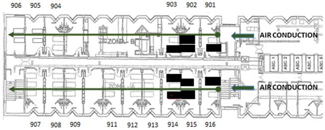 The distribution of the positive cases in the unit was well-defined (rooms 901, 902, 903, 914, 915, and 916), all of them were located in the first rooms, close to the entrance of the unit, where the airflow through two parallel impellers began.