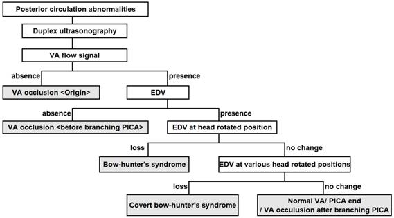 Ultrasonographic diagnostic chart for bow hunter's syndrome. Covert BHS is detected as follows. When the EDV of the VA is detectable, then the head should be rotated from side to side. BHS is suspected when the EDV of the VA disappears in a rotated position. When the EDV is maintained in simple rotation, the examiner should continue the evaluation at various head rotation angles. If the EDV is lost at a particular angle, the diagnosis of covert BHS can be confirmed. Abbreviations: BHS, bow-hunter's syndrome; EDV, end-diastolic flow velocity; PICA, posterior inferior cerebellar artery; VA, vertebral artery.