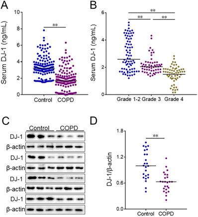 Serum DJ-1 was detected using ELISA in COPD patients and control subjects. We found that DJ-1 was reduced in COPD patients (Figure 1A). Moreover, the levels of serum DJ-1 were analyzed in different grades of COPD patients. The results indicated that serum DJ-1 was gradually decreased in parallel with the grades of COPD patients (Figure 1B). In addition, the expression of DJ-1 was detected in lung tissues of COPD patients and control cases through western blotting. Quantitative analysis of scanning densitometry was performed. As shown in Figure 1C and 1D, the expression of pulmonary DJ-1 was obviously down-regulated in COPD patients compared with control subjects.