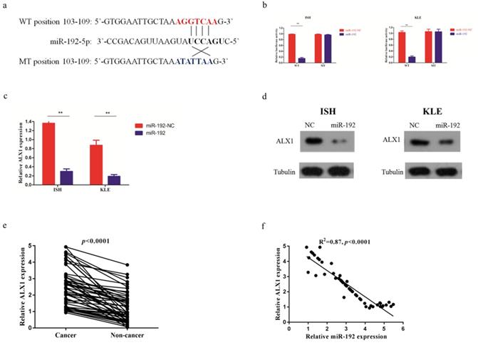 After searching in the commonly used microRNA databases, including DIANA-microT-CDS, TargetScan, and microrna, ALX1 was found to be one of the targets. To validate this prediction, the entire wild-type 3'-UTR of ALX1 or the mutant 3'-UTR with a 4-bp mutation in the seed region was cloned downstream of the luciferase gene's open reading frame (Figure 3a). The luciferase activities significantly decreased upon transfection of miR-192-5p mimics in the wild type reporter, with a fold change of 6.2 (0.99±0.03 vs 0.16±0.01, p<0.001). Conversely, the luciferase activities of mutant reporter was unaffected upon transfection with either miR-192-5p mimics or the control vector, with the relative luciferase activity of 0.98±0.01 and 0.96±0.02 (p=0.167) (Figure 3b). In addition, the ALX1 mRNA level (Figure 3c) and protein level (Figure 3d), were substantially reduced after miR-192-5p overexpression in both EC cell lines. The fold changes of ALX1 mRNA after miR-192 overexpression were 4.5 (1.36±0.12 vs 0.30 ±0.06, p=0.01) and 4.6 (0.88±0.11 vs 0.19±0.04, p=0.01) in ISH and KLE, respectively. Furthermore, in the 56 paired EC samples, ALX1 expression were significantly elevated in the cancerous tissues, compared with that in the non-cancerous tissues (Figure 3e) and we found a significant inverse correlation between relative ALX1 mRNA level and relative miR-192-5p expression (Figure 3f).